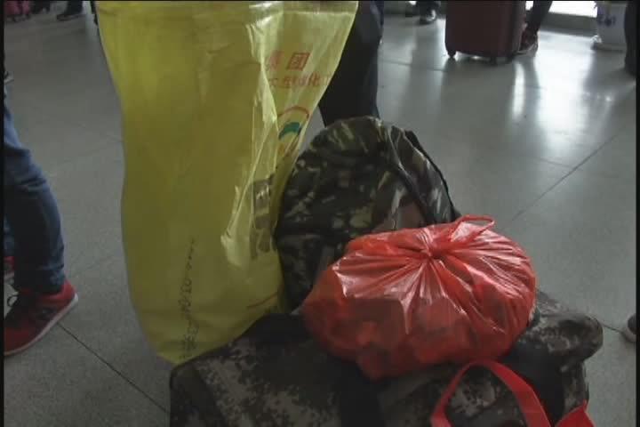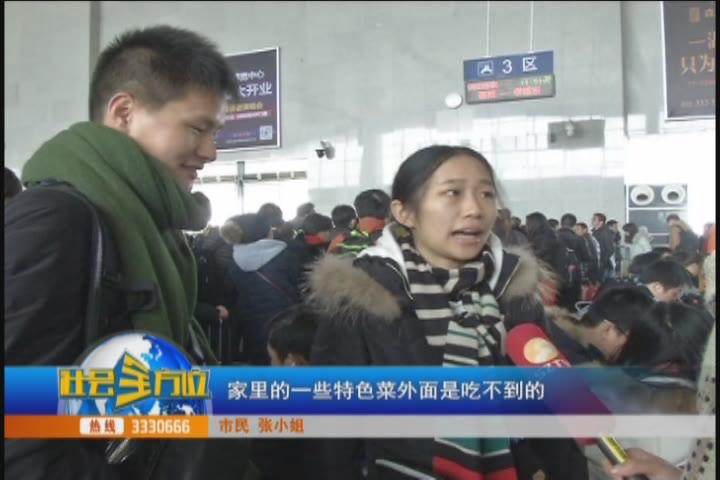 在火车站候车厅,记者看到,不少正准备出远门的市民,提着大包小包的行李正在候车,大大小小的包裹中,也藏着不少家乡的年货,鸡蛋、花生、香肠,应有尽有。家住环潭镇的刘先生正要回广州和儿子团聚,他高兴地告诉记者,此次出门,他把家里的腊肉香肠都带上了,合起来足足有30来斤。