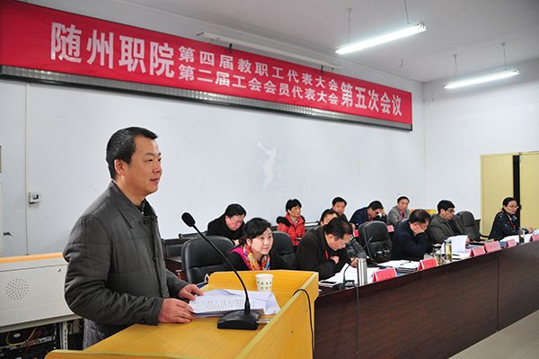 3月22日上午8点30分,随州职业技术学院第四届教职工代表大会第五次会议暨第二届工会会员代表大会第五次会议在庄严的国歌声中顺利召开,大会由学院纪委书记李高东同志主持。学院党委副书记、常务副院长胡洪波同志致开幕词!全体与会代表认真听取讨论审议并通过了学院院长马大奎所作的《学院工作报告》、副院长童加斌所作《第四届教职工代表大会第四次会议暨第二届工会会员代表大会第四次会议提案办理情况的报告》、工会副主席苏江华作的《随州职业技术学院工会工作报告》计财处处长孙伟作的《关于财务工作的报告》、和工会经济审查委员会主任陈明忠作的《随州职业技术学院工会经费审查工作报告》。