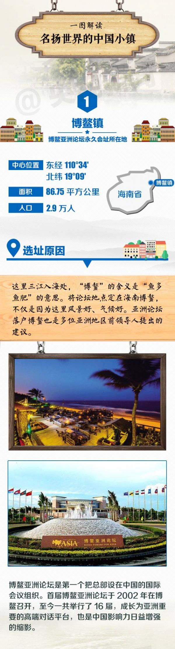 3月25日,博鳌亚洲论坛2017年年会在海南省博鳌开幕。博鳌,这个曾经名不见经传的海南小镇再次吸引了全世界的目光。其实,不仅是博鳌,中国的不少小城镇也都因为举办国际性的大型会议、活动,或因为承载了中国科技发展的巨大成就而受到世界瞩目。比如,浙江乌镇因为举办世界互联网大会受到国内外广泛关注。再比如,文昌卫星发射中心所在的龙楼镇。下面一起看看这些名扬世界的中国小镇。