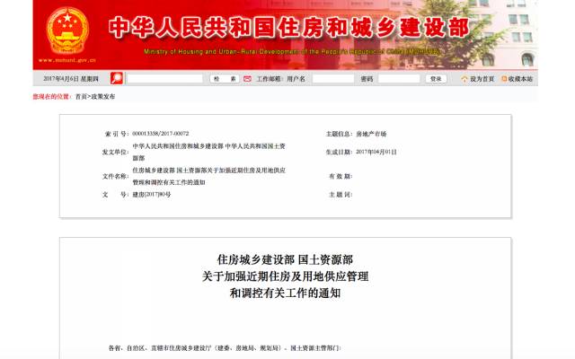 4月6日,住建部和国土部共同签发的《关于加强近期住房及用地供应管理和调控有关工作的通知》发布。这是自近期全国楼市调控升级后住建部第一次出台全国楼市调控的统领性文件。