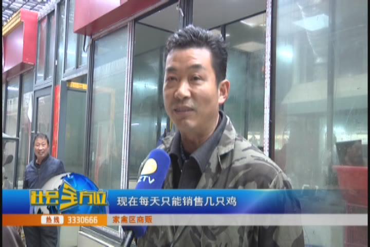 【采访】家禽区商贩:比如,以前母鸡是23块钱一斤左右,现在十几二十元一斤,比去年同期呢,比去年同期便宜两三块钱一斤。以前正常情况下每天大概销售四五十只鸡,现在每天只能销售几只鸡,有时候一天都没有人来买。一个月损失大概一万元左右。