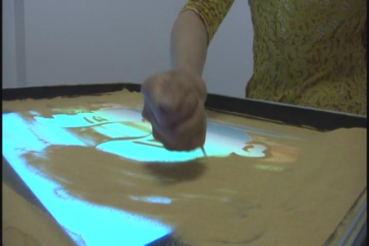 (同期声:朱慧玲)画一个婚礼的场景,要注意把喜庆的感觉画出来,刻画形象的时候一定要准确,沙要撒的均匀,对人物脸部的刻画背景的形象的刻画比较好。