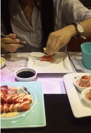吃完了水果之后,小编把柠檬分片挤到三文鱼刺身和甜虾上,并吃下去。