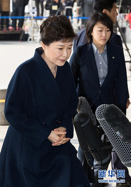 3月21日,在韩国首尔,朴槿惠抵达检察厅。当日,在韩国首尔,韩国前总统朴槿惠就亲信干政事件接受检方传唤。 新华社发(李相浩 摄)
