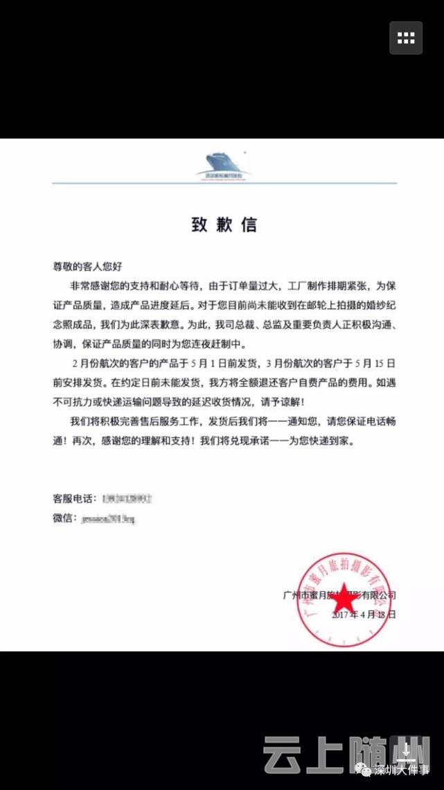 4月19日,新景界和蜜月旅拍沟通有了进展,蜜月旅拍答应5月1日前将所有照片快递,如有逾期,新景界要求蜜月旅拍全部退还自费拍照的钱,并贴出了蜜月旅拍的致歉信。