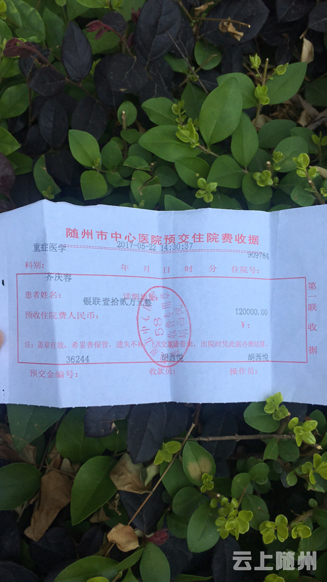 尊敬的爱心人士: 您们好! 我是患者的女儿,此时此刻正在重症医学科(ICU)病房外焦急的等候母亲的消息,患者是我的母亲齐庆容(49岁),家住湖北省随州市曾都区蒋家岗社区五组121号,2017年5月21日下午18:00时,母亲突感头部剧痛不能忍受,被亲戚发现后,立即拨打120急救车,送往随州市中心医院就诊,当时急诊科行头部CT检查有蛛网膜下腔出血,立即给予办理住院,在母亲办理住院手续后10分钟,母亲的病情突然加重,出现昏迷,休克等症状,后经复查头部CT及头部血管造影检查,祸不单行的母亲在第一次颅内出血后的短短10分钟后又出现了巨大的脑动脉瘤破裂出血,虽然当时在神经内科及ICU的多名医生的全力抢救下,没有出现呼吸心跳骤停,但也只能在重症监护室里以呼吸机及药物暂时维系生命。 自从母亲病重以来,父亲一直在重症监护室外守候母亲的消息,愁得3天都未曾合眼,整个人都看起来苍老了10岁,父亲有高血压也很有几年了,长期需要服用降压药,血压平时因为工作的原因也控制不是十分理想,现在加上这几天的劳累,血压情况也令人担忧。但是现在大家只想要全力挽救妈妈的生命,只要妈妈活着比什么都重要! 母亲平时特别勤劳,为人正直善良,人缘非常好。生病之前,家里的家务和所开的一家五金小店都是母亲一个人在操劳,家里的事从不让我们操心,父亲是一名普通的司机,上班也是十分辛苦,一家人虽然过得平淡,但是很幸福!但在母亲病倒之后,就像是缺了主心骨一样,没有了往日家庭的温馨和幸福,只有满泪的悲痛和无力,母亲住院短短的三天,已经做了大大小小数次手术,花光了家里的全部积蓄,其中光血管支架就花去了22万余元(不报销),现在在ICU病房里每天约1万元的治疗费也让我们的家庭负担不起,亲戚朋友能借的都借了,可依然昏迷不醒,上着呼吸机的母亲的治疗费仍不知还需多少,高昂的医疗费用沉沉的压在我们的肩头,让我们已经不堪重负,无力维系。但我们要母亲活下去的信念却越来越坚定。 无奈之下,只能含着眼泪写下这份求助信,希望社会中的好心人士为我们这个脆弱的家庭献出自己的一份爱心,世界上大概最痛苦的事情就是“树欲静而风不止,子欲养而亲不待”,我还没有能力孝敬养育我二十几年的母亲。所以这个难关我们一定要迈过去,恳求各位爱心人士帮忙转发和支持,让爱心传递下去,帮助我们走出困境,给我母亲活下去的希望!我和姐姐真心的感谢您们!我和姐姐相信有爱就会有希望!我们以后也会将这份沉甸甸的爱心继续传递下去! 联系电话:倪娜13886862223