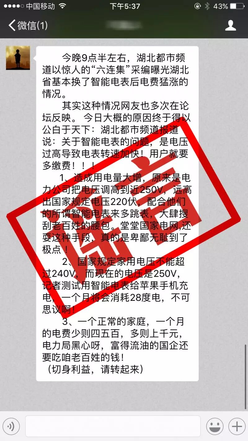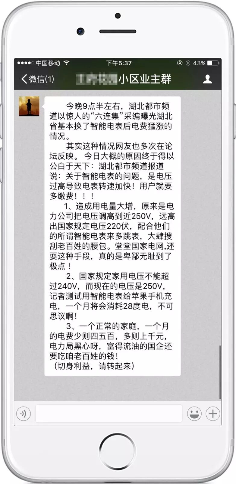 最近,武汉汉口某小区,因居民用户的电表已使用了6年,按电表5至8年的使用年限,供电公司计划对该小区居民用户的电表进行集体轮换。但在换表的当天,该小区多位业主阻挠换表施工,称:“电视台都曝光了,换了这种智能电表,供电公司就能把电压调高让电表转速加快,让我们多交电费!坚决不准换我们的电表!”