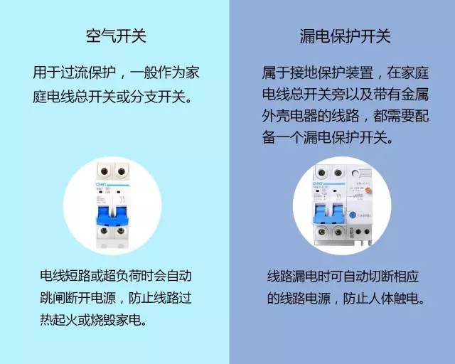 2.家长可以安装居家用电的两大护法——空气开关和漏电保护开关。虽然长得有点像,但分工很明确,各司其职全方位保护家中电线安全。