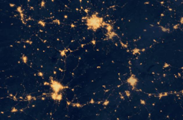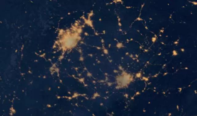 从城市灯光图上看,成渝城市群只有成都、重庆两大超级城市,其他都呈散点分布,中间地带尚未发展起来。