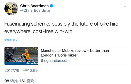 推特网友@Chris_Boardman则认为,(共享单车是)极好的方案,可能未来共享单车会随处可见,这是零成本的双赢。