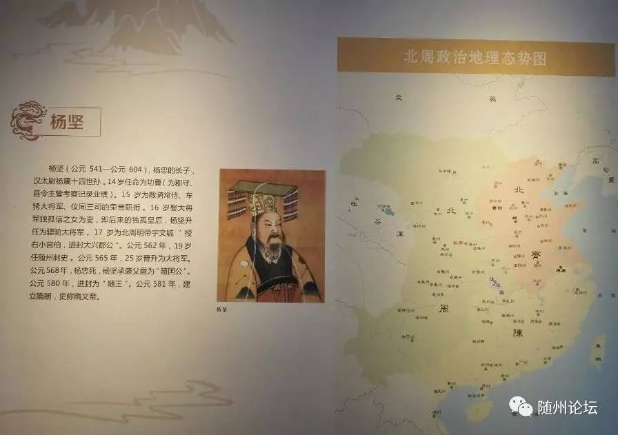 杨坚的父亲杨忠被封为“随国公”。杨坚承袭父爵为“随国公”,后进封为“随王”。22岁时,杨坚来随任随州刺史。杨坚借在随州任职期间加大自己的社会影响,广泛拉拢关系,扩大自己势力,为他日后夺得北周皇位和创立隋朝天下,起了很重要的作用。