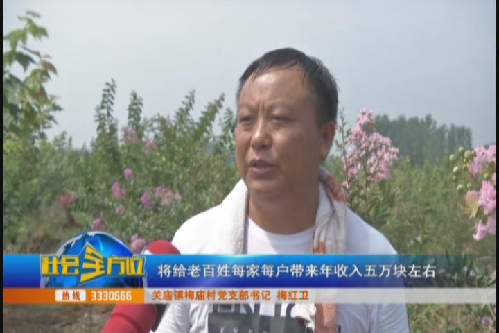 【同期声】关庙镇梅庙村党支部书记 梅红卫 我们站的这个花圃有几个品种,往南边那是红点红枫,红点红枫是冬月秋腊月开花,我们站在这儿的是海棠,海棠是3月和4月开花,我们左手这边的是紫薇,紫薇是789月开花,朝南边还有11种花树,合计面积有470亩,相当于一年四季都有花开。