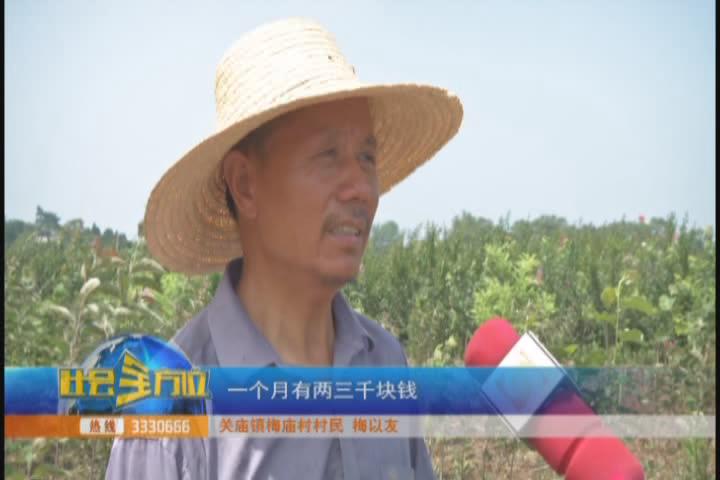 【采访】关庙镇梅庙村党支部书记 梅红卫:我们这里土地薄弱,也没有其他的经济发展,我把我们村的一班人带到(周边)看了好几个地方,加上我们外面看到别人搞那个观光旅游,我们这的土地适应搞这个花木基地,所以决定下来搞花木基地带动这里的老百姓收入增加。