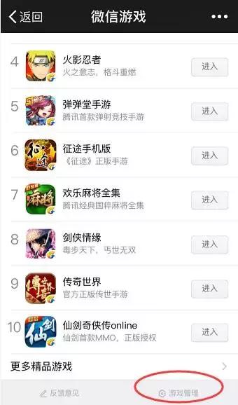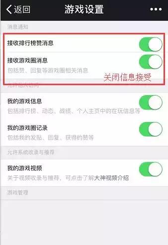 同样是进入微信后,依次点击 【发现】—【游戏】,下拉网页到底,点击页面底部的【游戏管理】图标(有的手机是直接选择右上角的游戏设置按钮)—然后分别将「接收排行榜赞消息」以及「接收游戏圈消息」关闭即可。