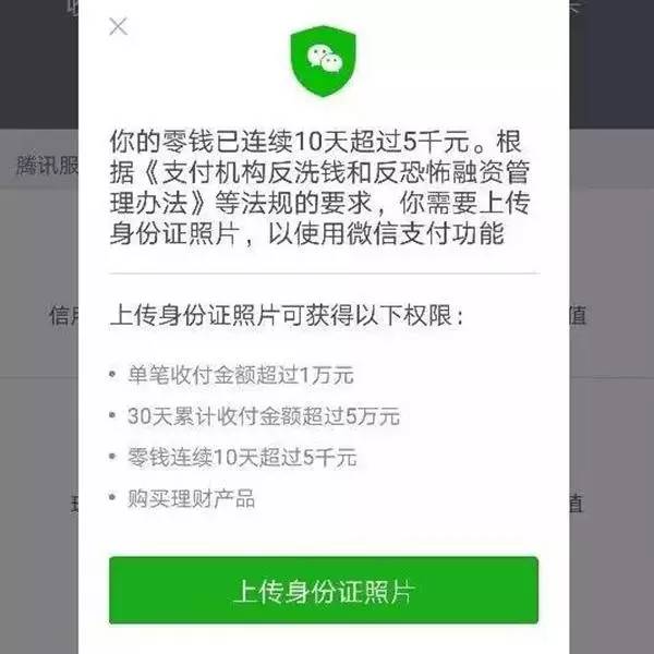 有网友晒出的图片显示,进入微信“钱包”后,弹出一条提示:“你的零钱已连续10天超过5000元。根据《支付机构反洗钱和反恐怖融资管理办法》等法规的要求,你需要上传身份证照片,以使用微信支付功能。上传身份证照片可获得以下权限:单笔收付金额超过1万元、30天累计收付金额超过5万元、零钱连续10天超过5000元、购买理财产品。”