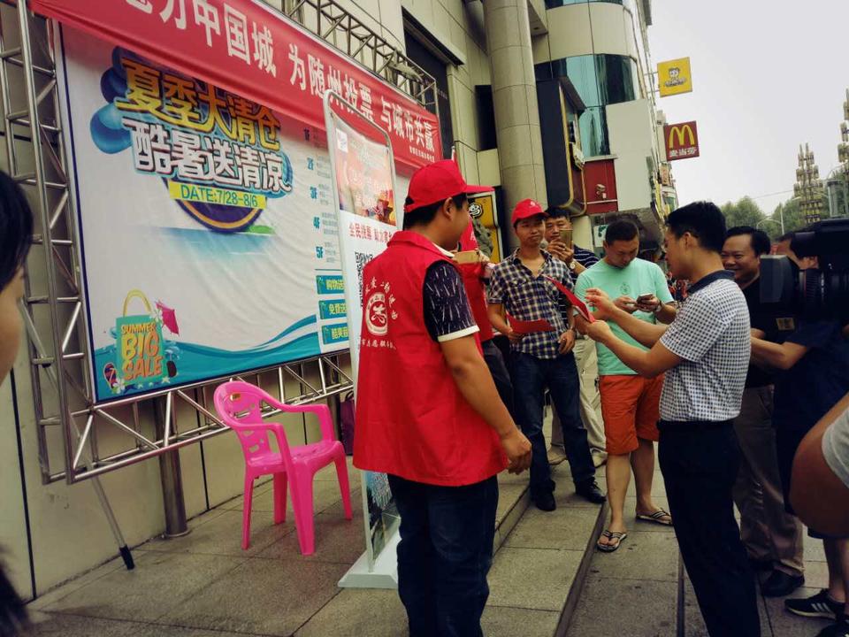 在解放路、大润发等人群密集的活动场所,只见一道道写着“魅力中国城,为随州投票,与城市共赢”的红色条幅格外醒目,志愿者们身穿红色马甲、头戴小红帽,向市民发放倡议书、讲解投票步骤,引导市民打开微信为随州投票。