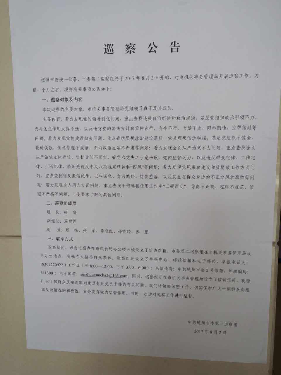市委第二巡察组进驻市机关事务管理局,将开展为期一个月的巡察。