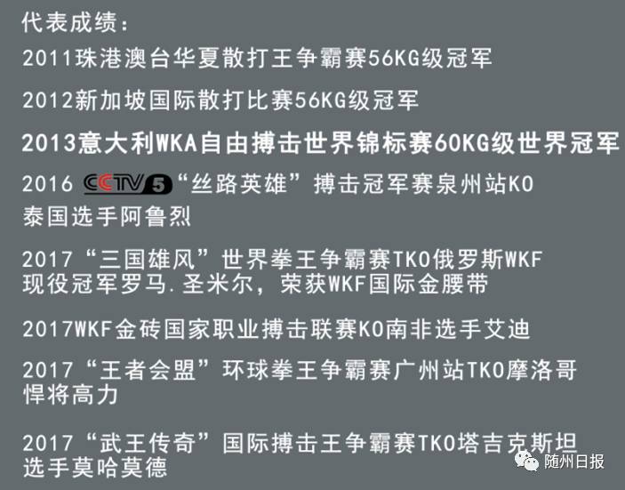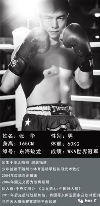张华,1983年出生于随县三里岗镇刘店村,目前在福建泉州打拼。34岁,经历亲人生离死别、双脚骨折武术生涯受阻、武馆倒闭事业挫败等人生低谷,以“战狼”精神,凤凰涅槃,练就“金左脚”,成为世界散打和自由搏击冠军,为国争光,为家乡赢得荣耀。