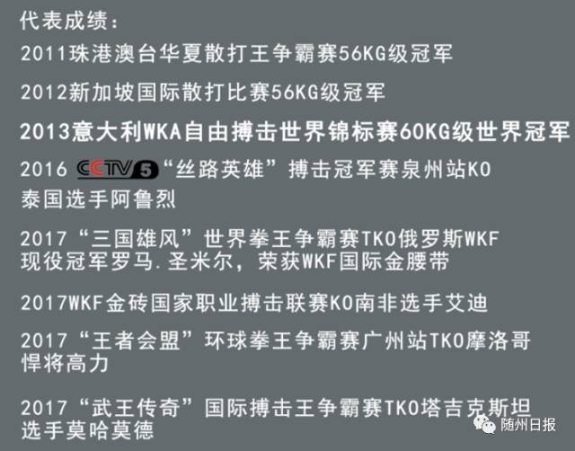 2013年,30岁,获得意大利WKA自由搏击世界锦标赛60KG世界冠军;