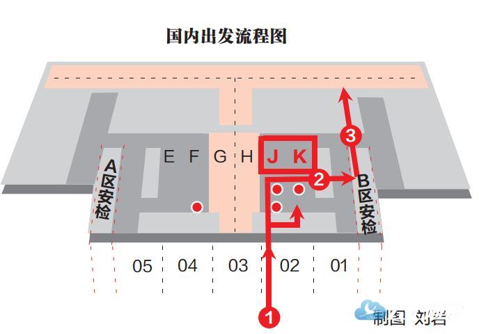 ②A区或B区安检(登机口01-30及801-804 的旅客在A区安检,登机口31-36的旅客在B区安检)