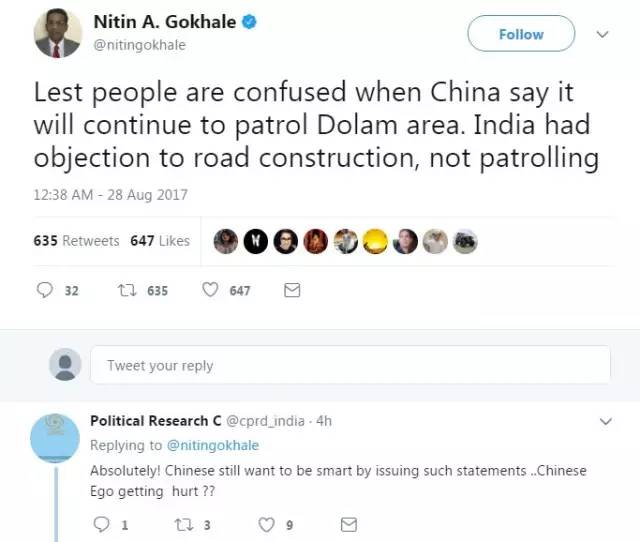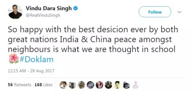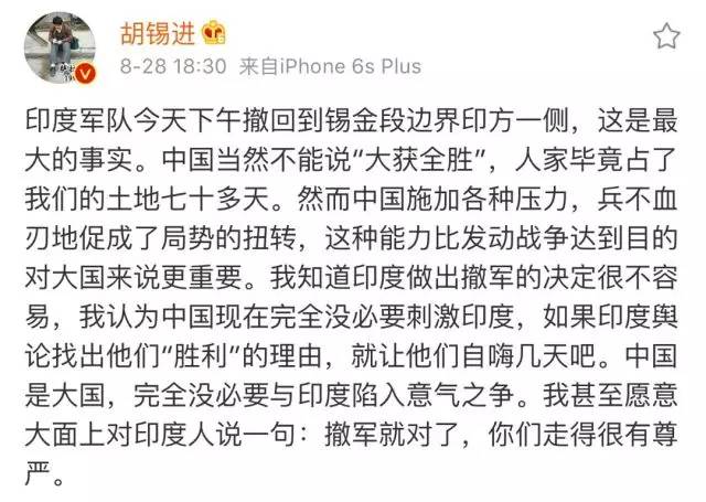 就连一直在猛烈抨击印度的环球时报总编辑胡锡进28日下午都发了一个姿态很高的微博: