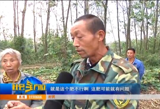 【采访】村民:这叶子已经缩了,你看到没,这叶已经缩进去了,你看别人没打的,这叶子长得多好。那你认为是什么原因呢!就是这个肥不行啊,这肥可能就有问题。