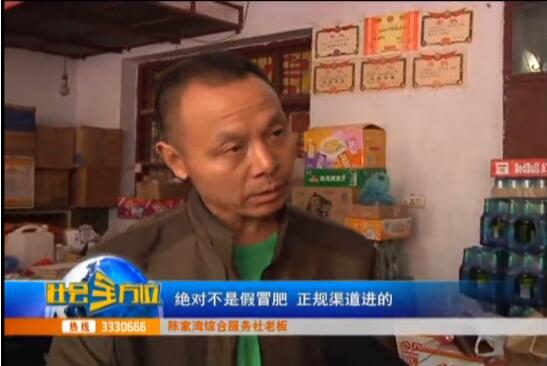 【采访】陈家湾综合服务社老板:绝对不是假冒肥,正规渠道进的,你可以通过各方面都可以检验,要是真正属于我肥的质量问题,我可以说负一切些责任,可以说这个话。