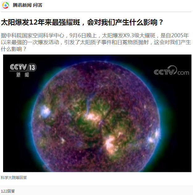 9月6日晚,太阳爆发X9.3级大耀斑,引发太阳质子事件和日冕物质抛射。这是自2005年以来,太阳最强的一次爆发活动,打响了新一轮太阳风暴的第一枪。目前已经发生的中等太阳质子事件仍在继续,可能仍将持续2天至3天。不过,大家不用恐慌,相关单位及科普作家在企鹅问答上已经为大家详细介绍和分析了此次的太阳爆发活动。