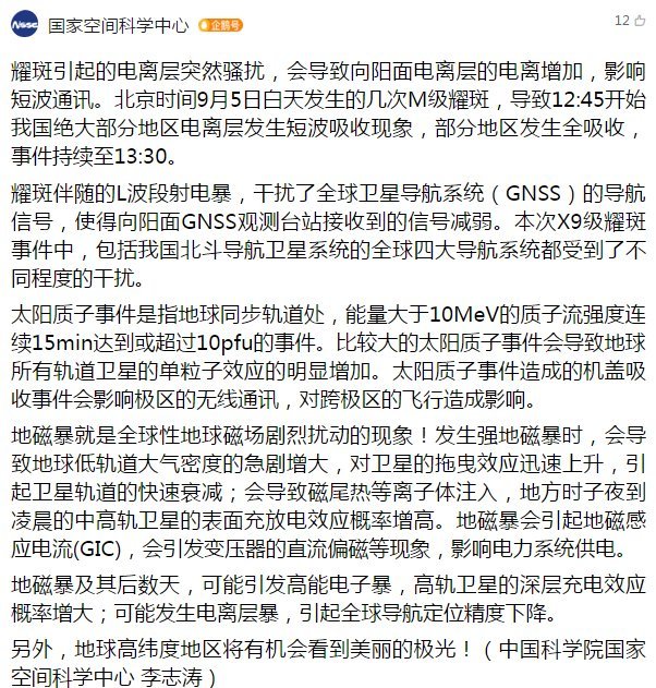 根据中国科学院国家空间科学中心最新消息,北京时间9月6日19:53爆发的12年来最强太阳耀斑(X9.3级)所伴随的太阳日冕物质抛射已于今早06:30到达地球,并引起强烈地磁暴。专家提醒,公众不必恐慌,地磁暴对人体没有危害。但要加强对空间环境扰动的关注,确保运行在日地空间的卫星等飞行器的安全。