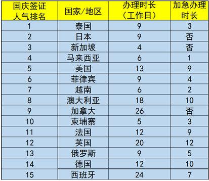 按签证申请办理人数从高到低排名,携程旅游发布“国庆签证热门目的地TOP15”依次是:泰国、日本、新加坡、马来西亚、美国、菲律宾、越南、澳大利亚、加拿大、柬埔寨、法国、英国、俄罗斯、德国、西班牙。通过携程等旅游网站和旅行社办理这些热门目的地的签证,从收齐制作材料、等待面试、领馆受理到出签配送,需要4到26个工作日不等。除了欧美澳洲长线国家,大部分周边国家和地区,办签时间在10天以内,抓紧办理还可能赶上国庆旅游。为了赶上国庆旅游,建议游客尽可能选择办签证时间短的目的地。如果需要加急,也可以通过携程等服务商选择特殊签证产品,加急最快只需1-5个工作日不等。