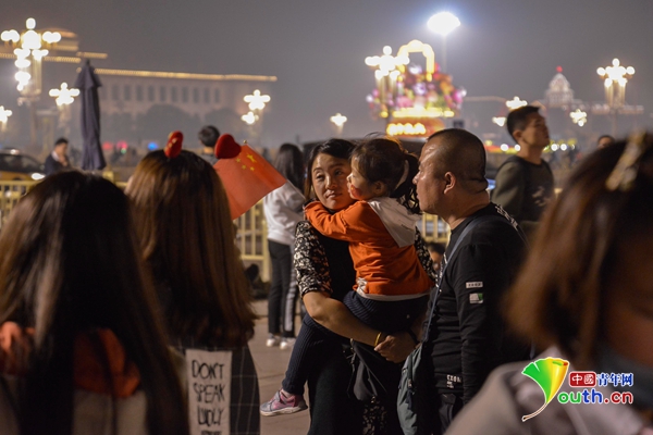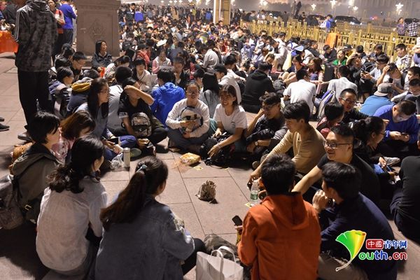 中国青年网北京10月1日电(记者李永鹏 孙钊 刘利影)随着“国庆、中秋”十一双节的到来,许多来自祖国各地的游客齐聚天安门为祖国庆生。9月30日晚,不少人携带亲友排队熬夜等候观看升旗仪式。排队现场,许多青年男女席地而坐,或打牌、或游戏以等候黎明时国旗升起。