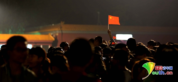人潮中,一位游客举起手中的国旗。 中国青年网记者孙钊摄