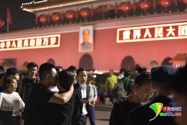 一对情侣在合影留念后相吻。 中国青年网记者李永鹏摄