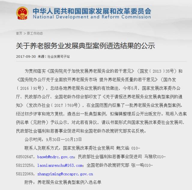 日前,国家发展改革委办公厅、民政部办公厅、全国老龄办综合部,在全国范围内选出了一批养老服务业发展的典型案例,并将入选案例名单向社会公示。