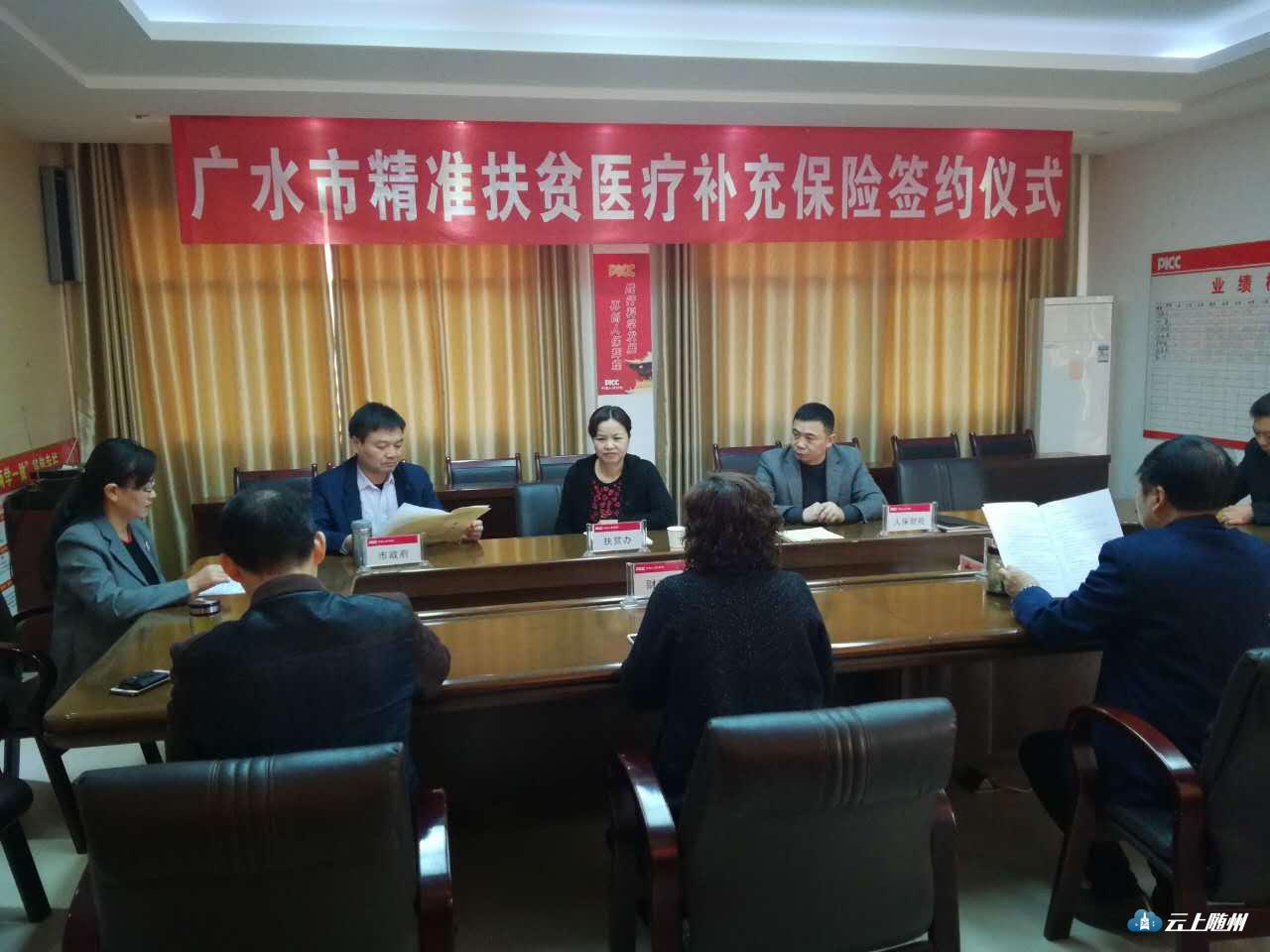 11月9日,广水市举行精准扶贫医疗补充保险签约仪式,广水市政府扶贫办与中国人民财产保险股份有限公司广水支公司正式签约,把该市2017年建档立卡贫困人口纳入精准扶贫救助对象大病补充医疗保险范围。