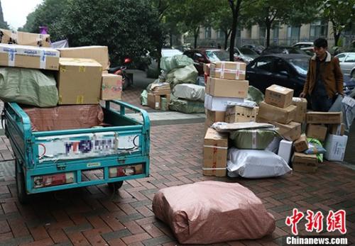 资料图:2016年11月17日,浙江省杭州市某小区门口堆放大量包裹。中新社记者 何蒋勇 摄