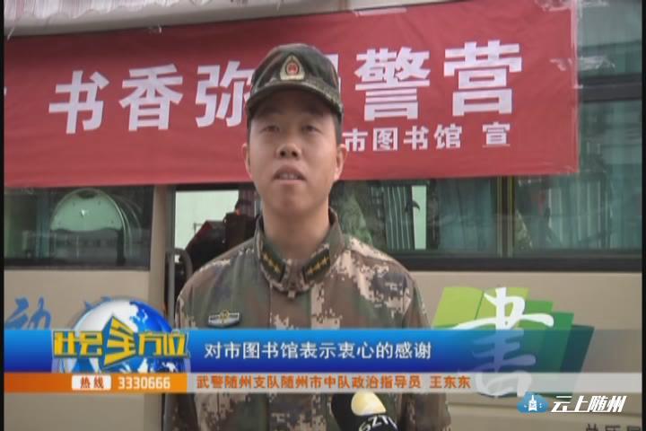 (采访:武警随州支队随州市中队政治指导员 王东东)图书进警营给我们中队送来了图书,可以说是给战士们送来了精神食粮,大力支持了我们的文化建设,在这里我也代表我们中队全体官兵对市图书馆表示衷心的感谢。