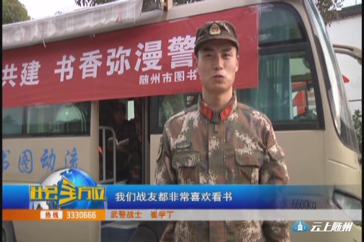 为丰富驻随官兵精神文化生活,让他们足不出户就能读到新书、好书,市图书馆开展了“军民携手共建,书香弥漫警营”活动,将装载着3000多册图书的流动图书车开到了武警随州支队随州市中队,把缕缕书香送给那里的官兵。