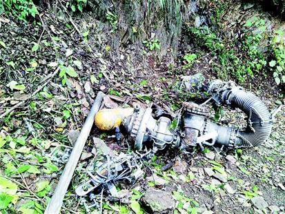 昨日下午1时许,竹山县柳林乡公祖村的村民突然听到一阵“轰隆隆……”的巨响,家里的窗户晃动得厉害,有的村民吓得跑到了屋外。后来,有村民循声寻找,在村后马鬃岭山的树林里,发现了大量疑似发动机零件的物件。