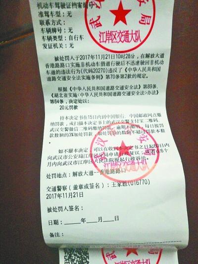 骑自行车也会被罚?没错!该市民以网名“神的左手”发帖称:11月21日上午10点28分,他骑自行车经过汉口解放大道香港路路口时,突然被路口值勤的交警拦下,交警指出其骑自行车违法,并当场开出了一张罚单,罚款20元。他感到委屈:大家平时不都是这样骑行吗?